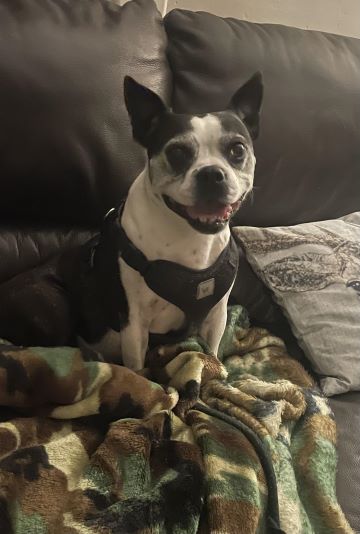 a 9 year old Boston terrier mix whose owner had to go into a nursing